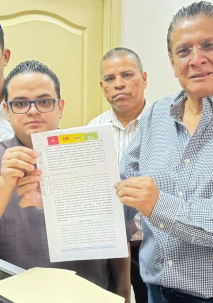 Los dirigentes Jorge Fernando Jimenez Reyes del Frente Amplio,Alfonso Diaz Narvaez,presidente del Partido Unificacion Democratica(UD),Angel Leodan Hernandez, Coordinador del Partido Movimiento Solidario(Vamos) y Esdras Amado Lopez,presidente del Partido Nuev Ruta, presentaron al CNE un escrito de recusación contra el consejero propietario Julio Navarro,para que no conozca asunto relacionado con la naturaleza de sus partidos politicos.