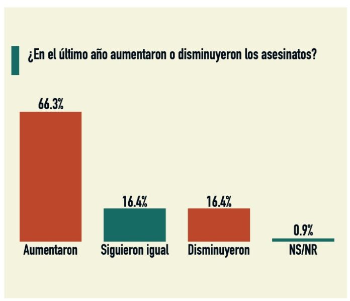 En el caso particular de Seguridad y asesinatos los Jesuitas publicaron una cifra de terror respecto a este tema, a la pregunta: ¿En el ultimo año aumentaron o disminuyeron los asesinatos? la respuesta ha sido contundente, el 66.3 % de la población es del criterio que a aumentado los asesinatos.