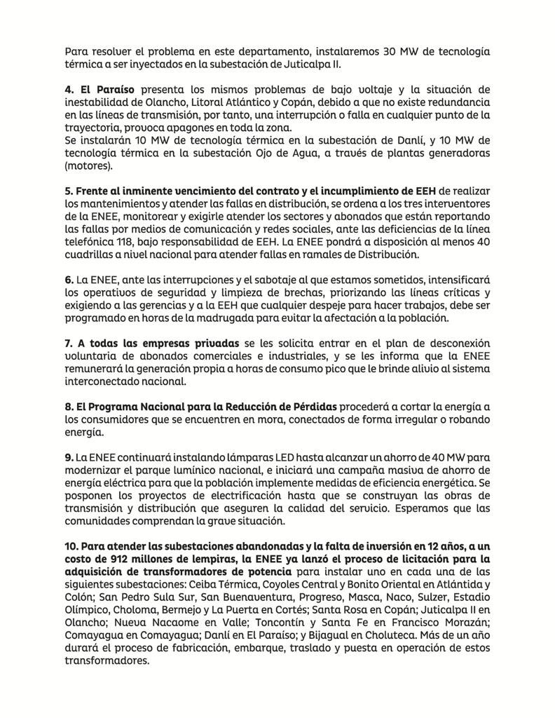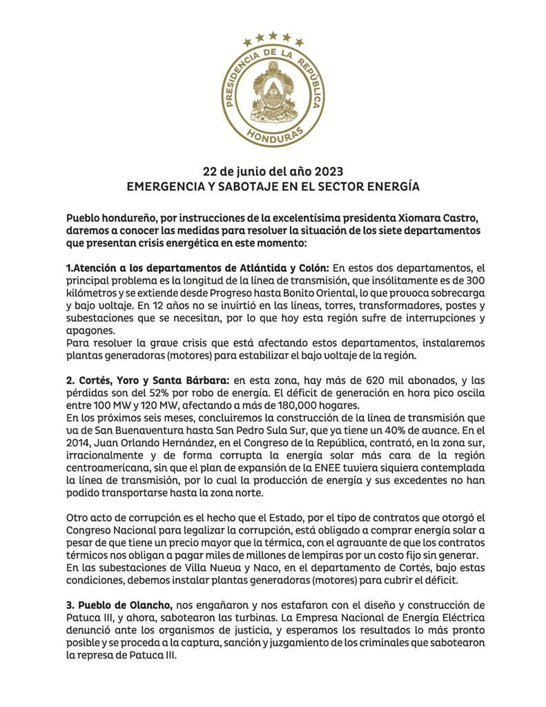Gobierno anuncia medidas para mitigar impacto de apagones, hondureños exigen no seguir en tinieblas. Noticias 23 de junio de 2023 Cuota FacebookTwitterWhatsApp Las autoridades de la Empresa Nacional de Energia Electrica anunciaron en cadena de radio y televisión una serie de medidas orientadas a mitigar el impacto que generan los apagones en el país. A continuación el detalle de las medidas anunciadas: Cuota FacebookTwitterWhatsApp Lo más nuevo Noticias La reconocida empresa colombiana PRODOS SAS certifica a través de un análisis técnico forense que los audios publicados por el Fiscal General son... 31 de octubre de 2025 Noticias A un mes de ser inaugurado se inunda el nuevo hospital de Roatán 27 de octubre de 2025 Noticias TJE instala sesión con dos Magistrados para inscribir a Jorge Calix a pesar de ser ilegal 27 de octubre de 2025 Noticias Un hombre fue arrestado por ofrecer 45.000 dólares de recompensa por asesinar a Pam Bondi 27 de octubre de 2025 Noticias relacionadas Noticias La reconocida empresa colombiana PRODOS SAS certifica a través de un análisis técnico forense que los audios publicados por el Fiscal General son... 31 de octubre de 2025 Noticias A un mes de ser inaugurado se inunda el nuevo hospital de Roatán 27 de octubre de 2025 Noticias TJE instala sesión con dos Magistrados para inscribir a Jorge Calix a pesar de ser ilegal 27 de octubre de 2025 Noticias Un hombre fue arrestado por ofrecer 45.000 dólares de recompensa por asesinar a Pam Bondi 27 de octubre de 2025