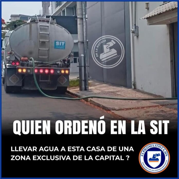Contrario a la política social impulsada por la Presidenta Xiomara Castro de llevar agua a los más pobres, en la Secretaria de Infraestructura al parecer la linea es otra, este dia trascendio una fotografía donde se observa con sumo detalle que una pipa de agua de dicha secretaria de estado abastece de agua una lujosa residencia ubicada en las Lomas del Jigarro de la capital.