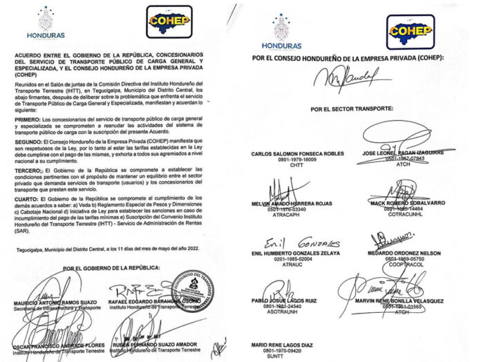El documento que fue suscrito por todas las partes, incluyendo las autoridades del Instituto Hondureño del Transporte Terrestre (IHTT), establece lo siguiente: